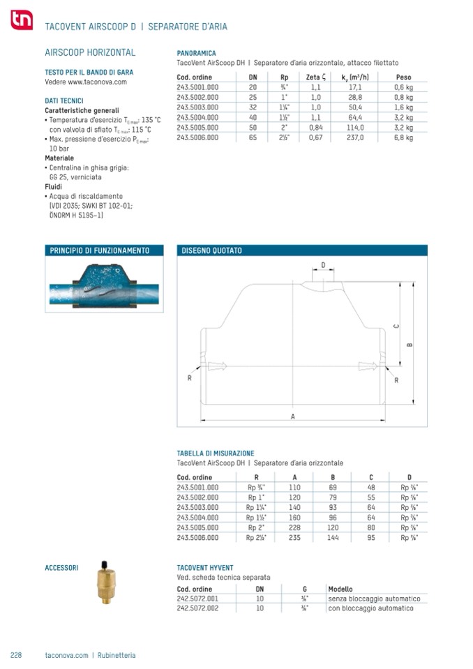 TacoVent AirScoop DH | Separatore d’aria orizzontale, attacco filettato