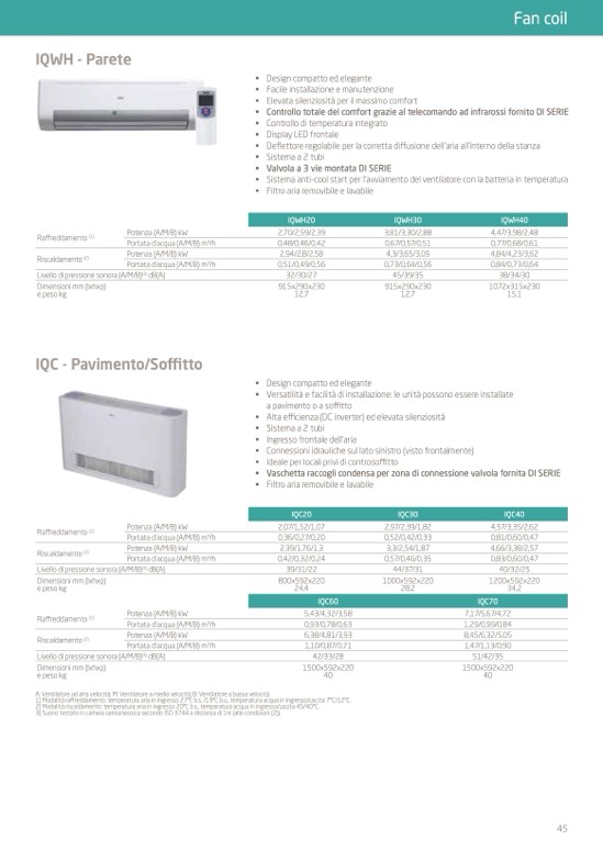 2) Modalità riscaldamento: temperatura aria in ingresso 20°C b.s., temperatura acqua in ingresso/uscita 45/40°C.