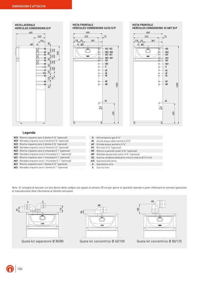 Nota: Si consiglia di lasciare sul lato destro della caldaia uno spazio di almeno 30 cm per aprire lo sportello laterale e poter effettuare le normali operazioni
