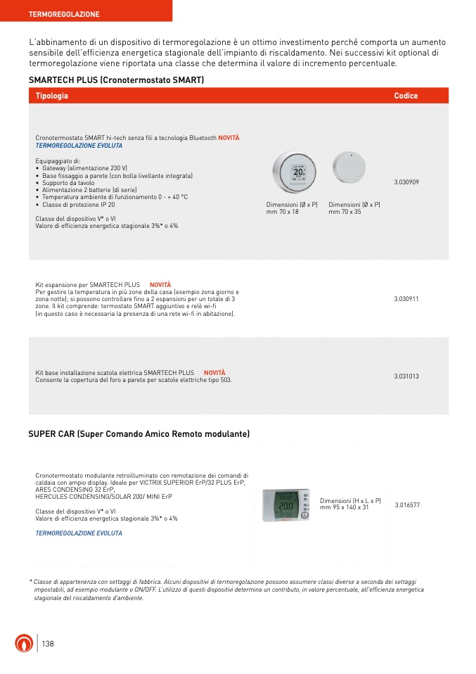 * Classe di appartenenza con settaggi di fabbrica. Alcuni dispositivi di termoregolazione possono assumere classi diverse a seconda dei settaggi