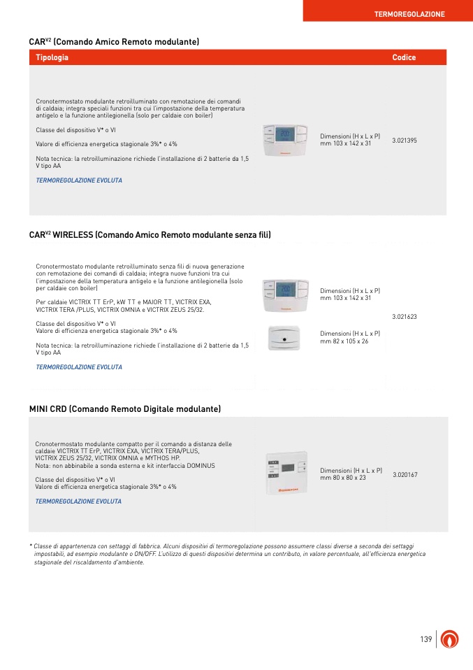 * Classe di appartenenza con settaggi di fabbrica. Alcuni dispositivi di termoregolazione possono assumere classi diverse a seconda dei settaggi