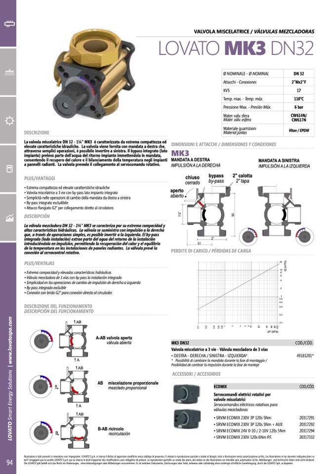 elevate caratteristiche idrauliche. La valvola viene fornita con mandata a destra che,