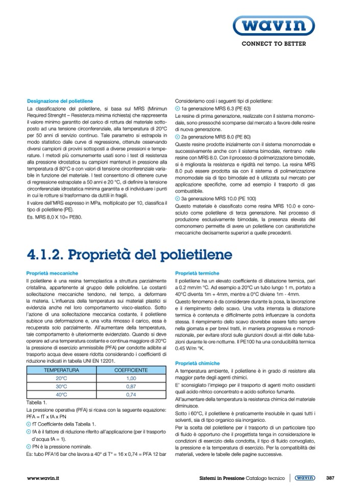 Es: tubo PFA16 bar che lavora a 40° di T° = 16 x 0,74 = PFA 12 bar
