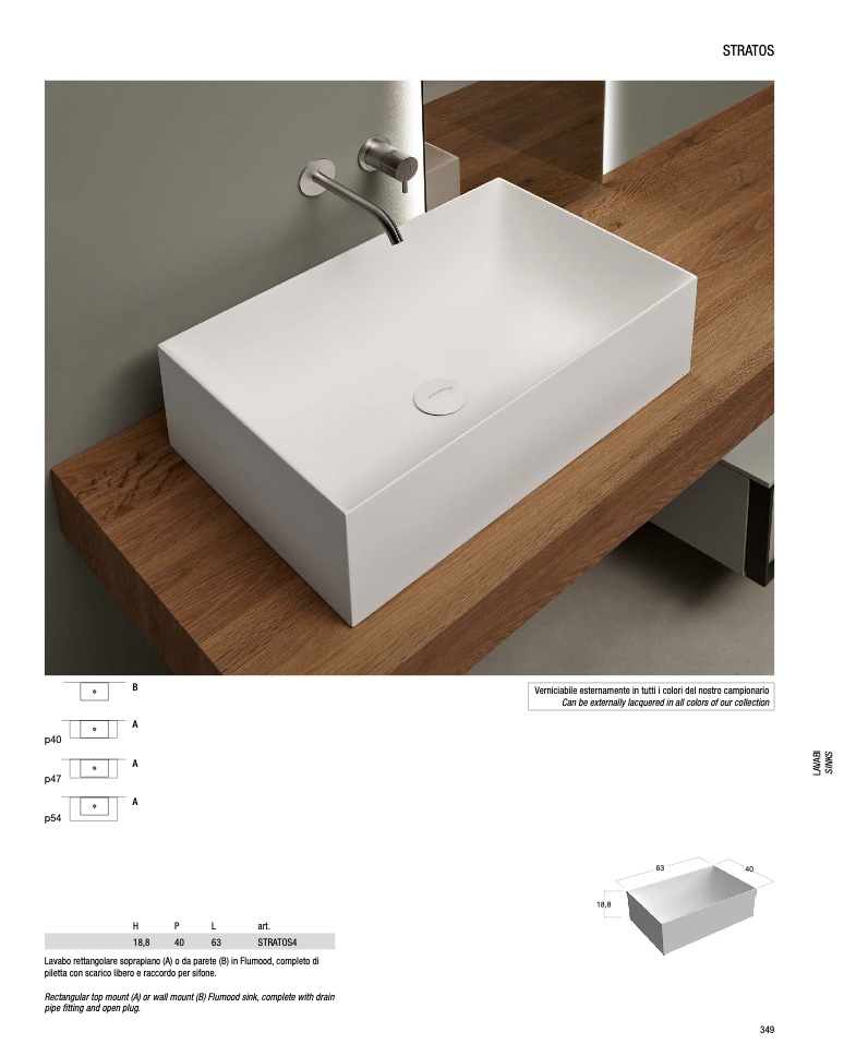 Lavabo rettangolare soprapiano (A) o da parete (B) in Flumood, completo di