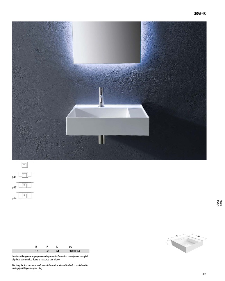 Lavabo rettangolare soprapiano o da parete in Ceramilux con ripiano, completo