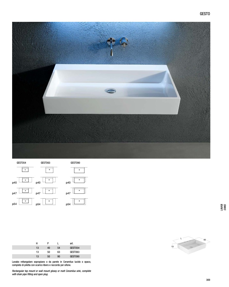 Rectangular top mount or wall mount glossy or matt Ceramilux sink, complete
