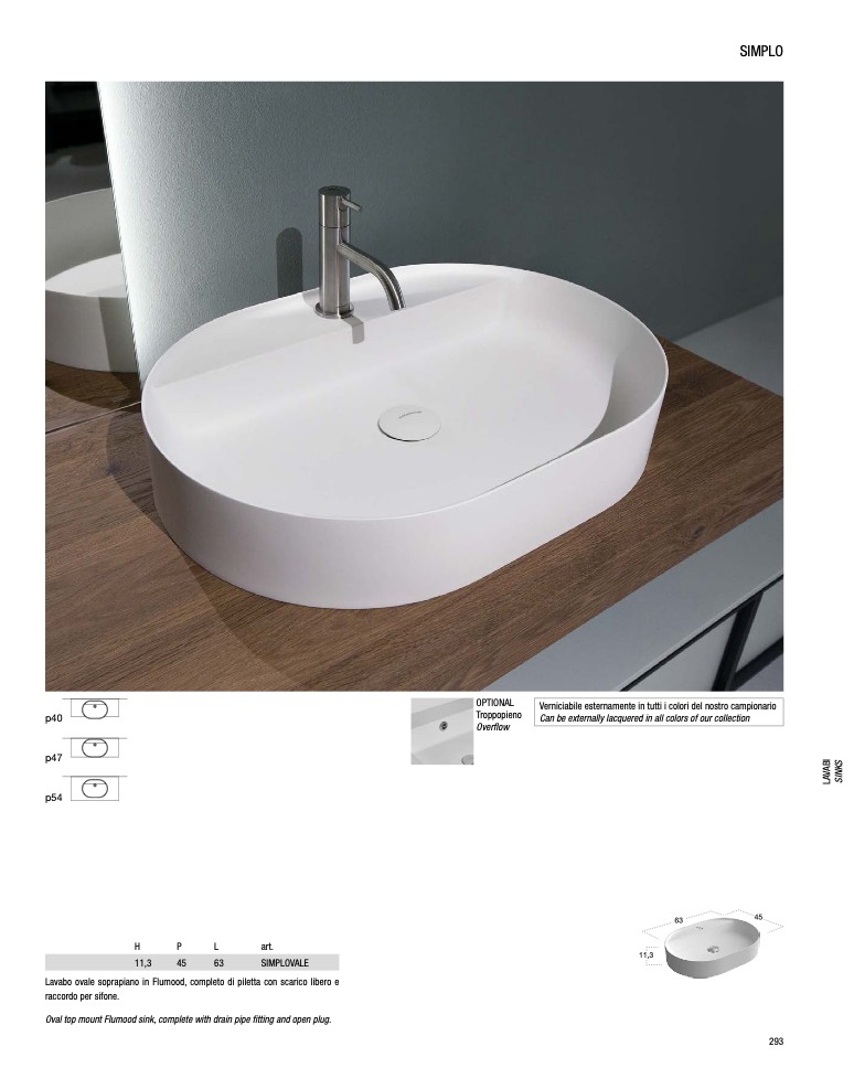 Lavabo ovale soprapiano in Flumood, completo di piletta con scarico libero e