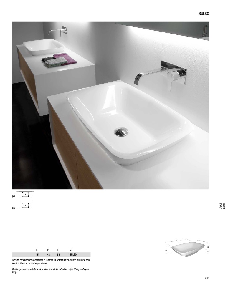Lavabo rettangolare soprapiano a incasso in Ceramilux completo di piletta con