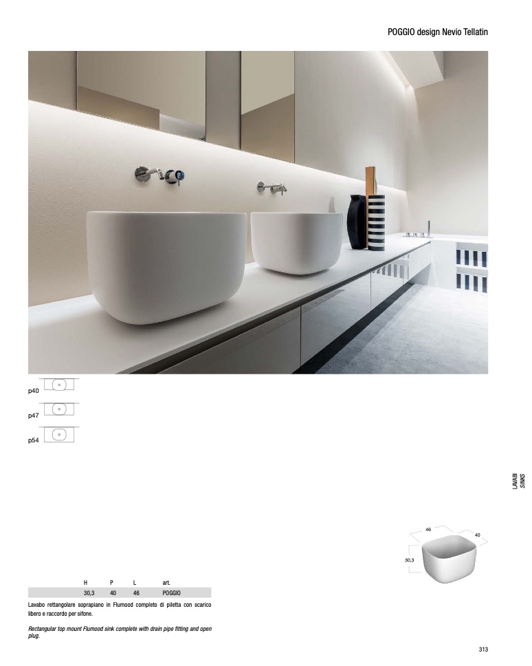 Lavabo rettangolare soprapiano in Flumood completo di piletta con scarico