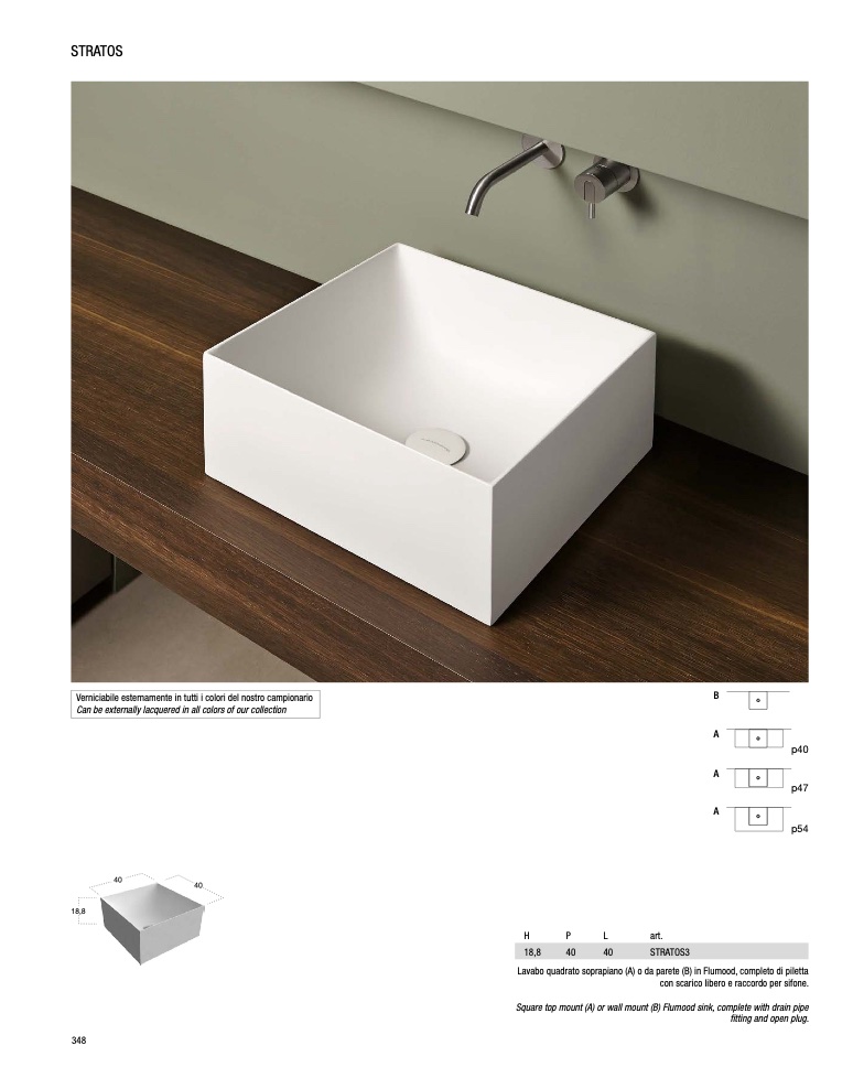 Lavabo quadrato soprapiano (A) o da parete (B) in Flumood, completo di piletta
