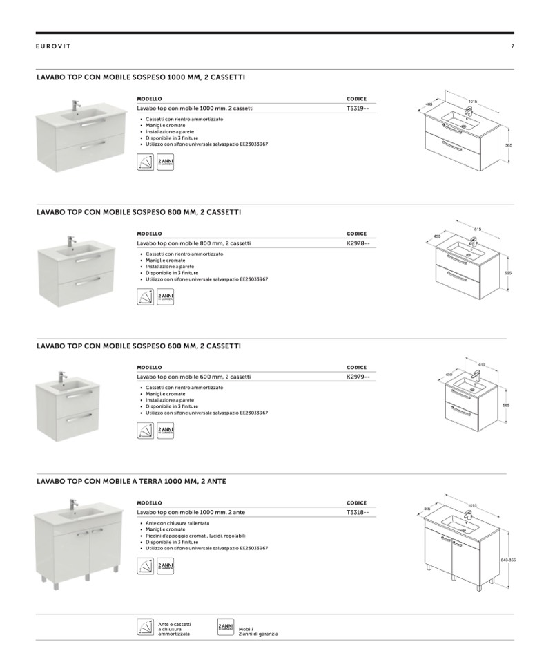 LAVABO TOP CON MOBILE SOSPESO 800 MM, 2 CASSETTI