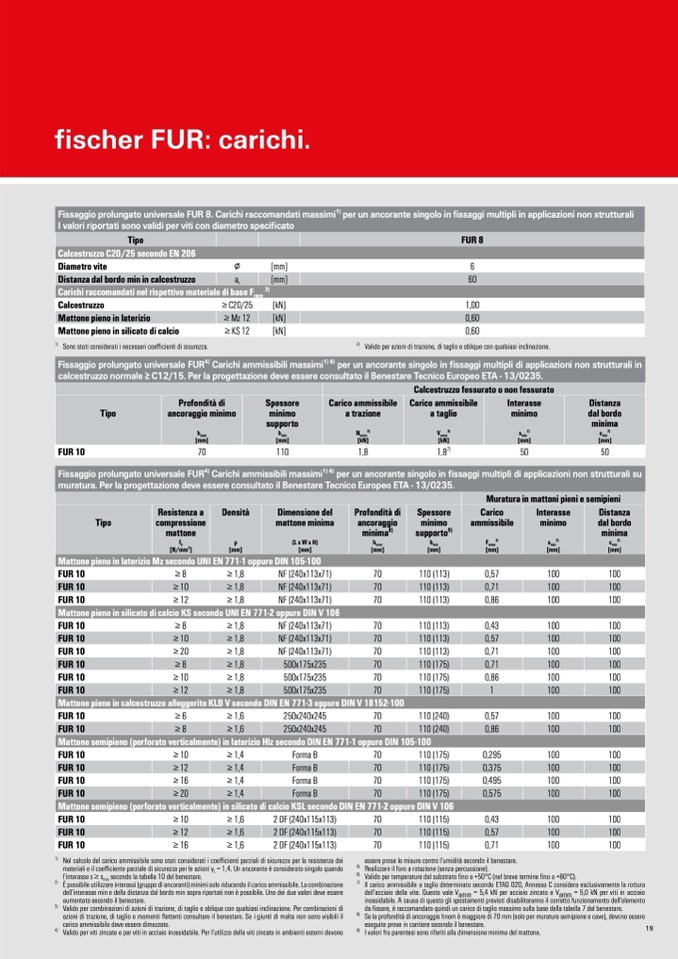 Fissaggio prolungato universale FUR 8. Carichi raccomandati massimi