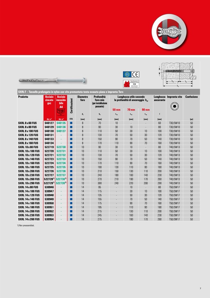 SXRL-T – Tassello prolungato in nylon con vite premontata testa svasata piana e impronta Torx