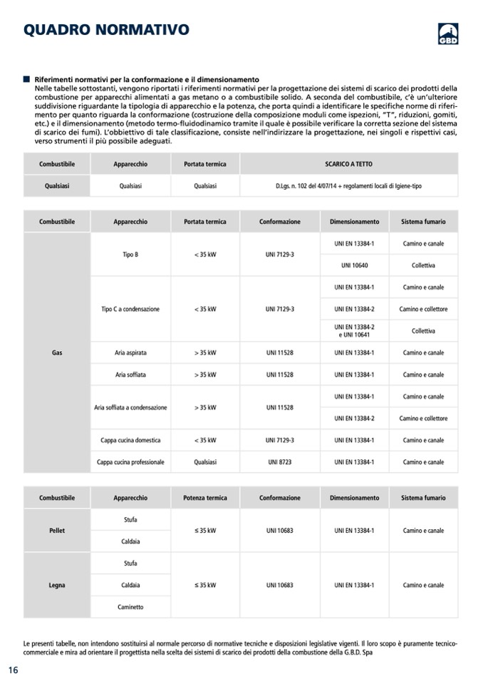 Nelle tabelle sottostanti, vengono riportati i riferimenti normativi per la progettazione dei sistemi di scarico dei prodotti della