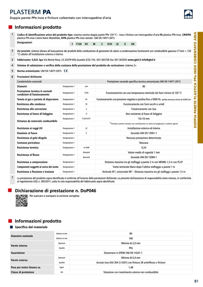 Codice di identificazione unico del prodotto-tipo: sistema camino doppia parete PPe 120 °C – inox e finiture con intercapedine d’aria PA plastica PPe-inox, CRM/PA