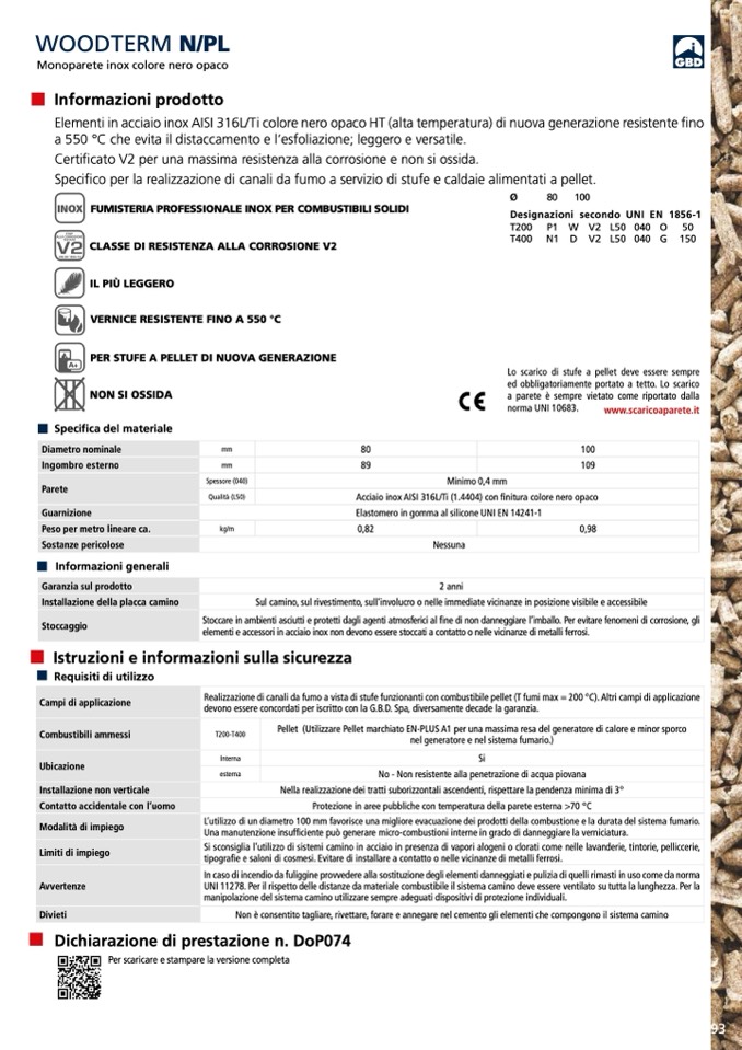 L’utilizzo di un diametro 100 mm favorisce una migliore evacuazione dei prodotti della combustione e la durata del sistema fumario.
