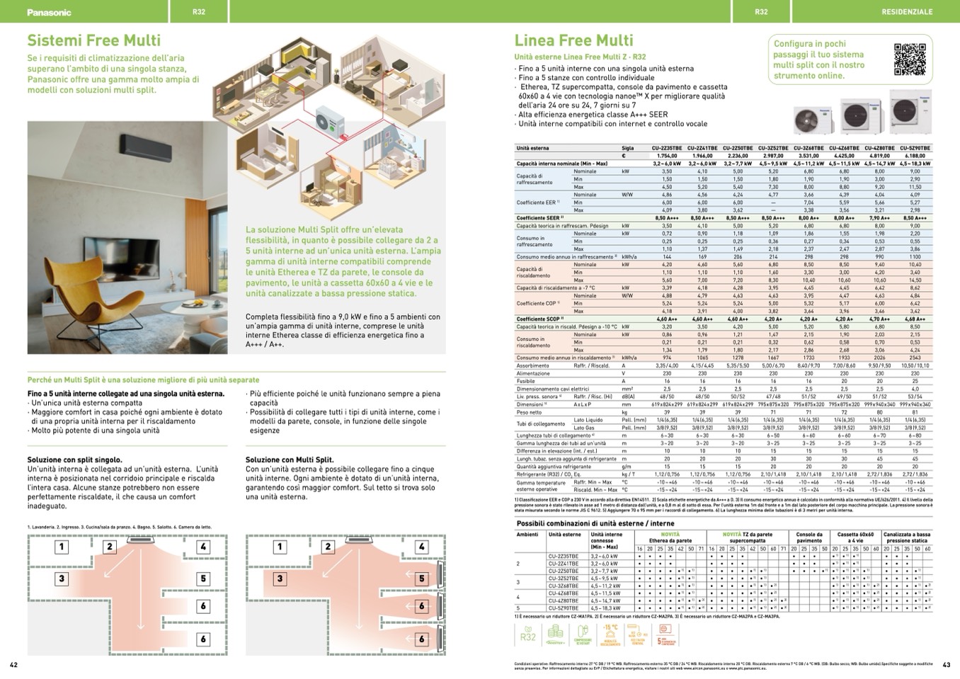 Condizioni operative: Raffrescamento interno 27 °C DB / 19 °C WB. Raffrescamento esterno 35 °C DB / 24 °C WB. Riscaldamento interno 20 °C DB. Riscaldamento esterno 7 °C DB / 6 °C WB. (DB: Bulbo secco; WB: Bulbo umido).Specifiche soggette a modifiche