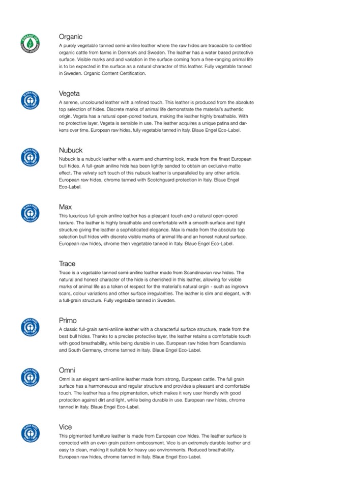 European raw hides, chrome tanned in Italy. Blaue Engel Eco-Label.