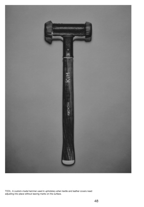 TOOL. A custom-made hammer used in upholstery when textile and leather covers need