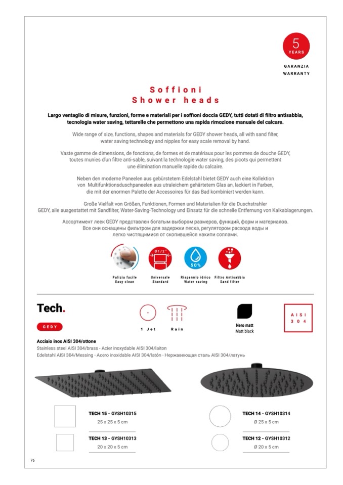 Wide range of size, functions, shapes and materials for GEDY shower heads, all with sand filter,