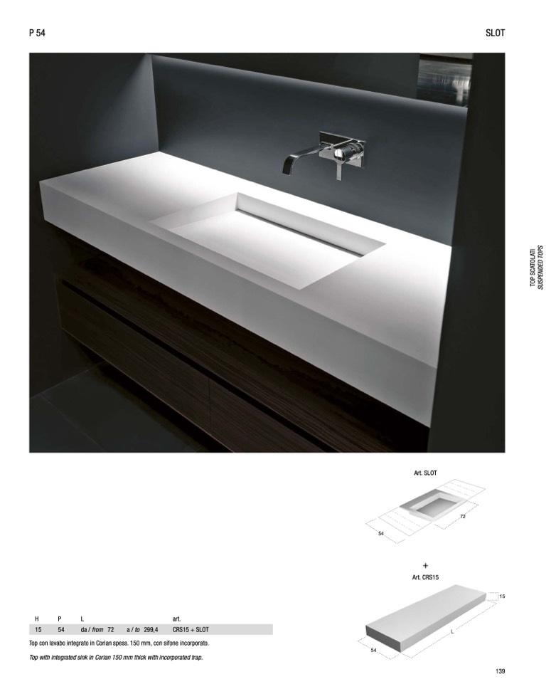 Top with integrated sink in Corian 150 mm thick with incorporated trap.