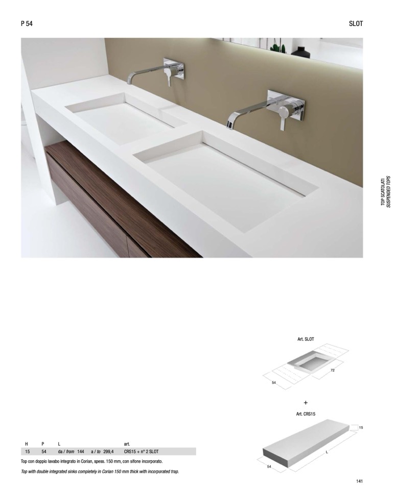 Top con doppio lavabo integrato in Corian, spess. 150 mm, con sifone incorporato.