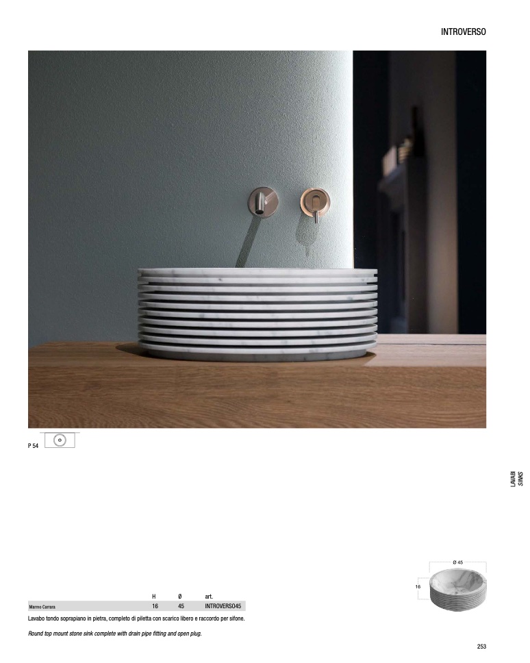 Lavabo tondo soprapiano in pietra, completo di piletta con scarico libero e raccordo per sifone.