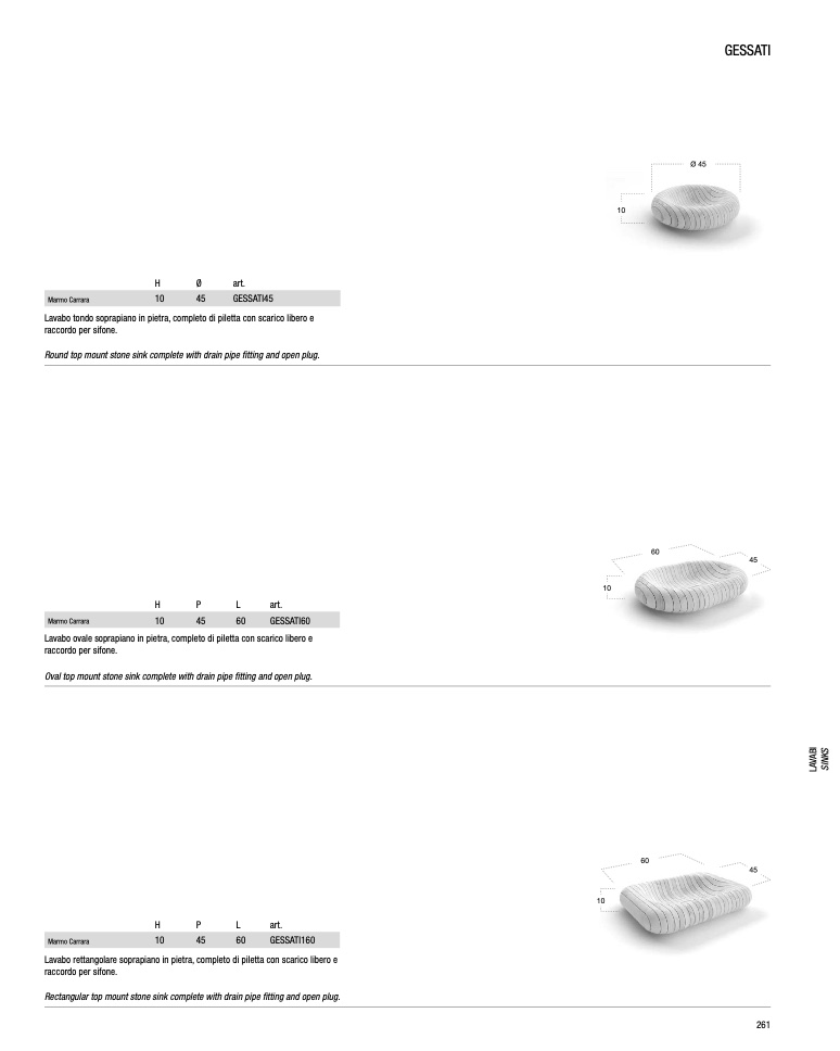 Lavabo ovale soprapiano in pietra, completo di piletta con scarico libero e