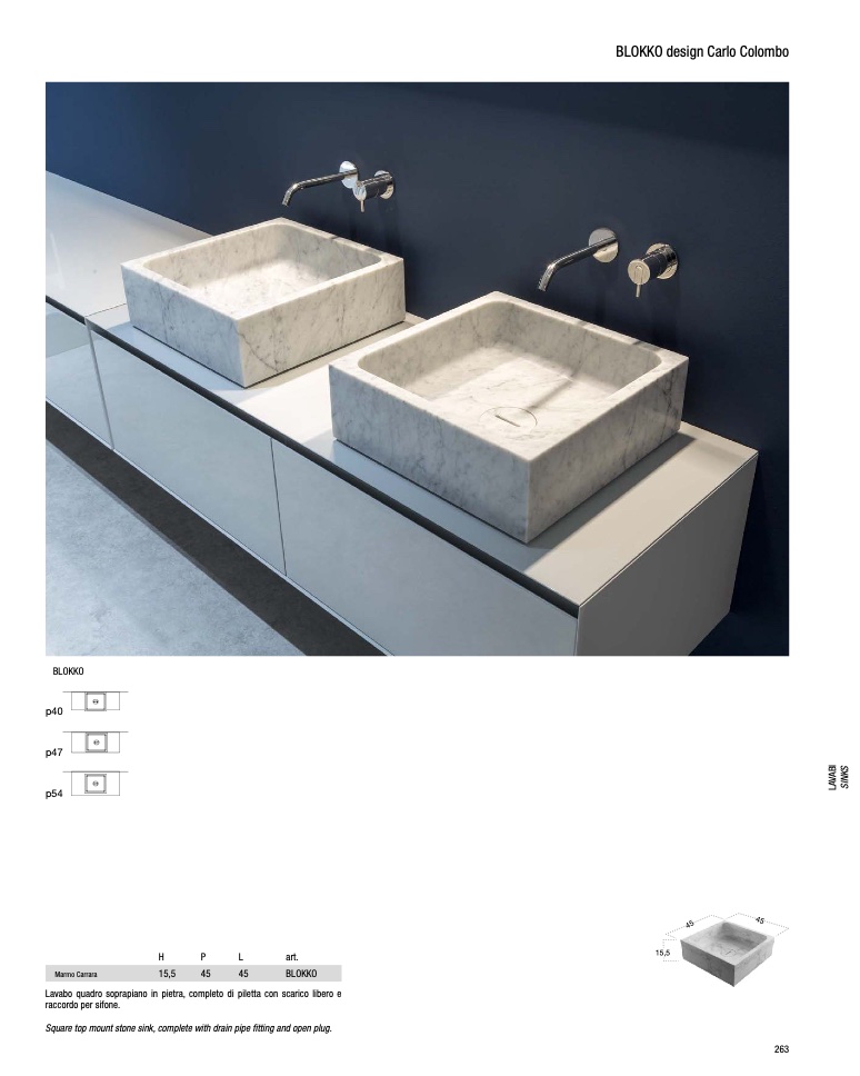 Lavabo quadro soprapiano in pietra, completo di piletta con scarico libero e