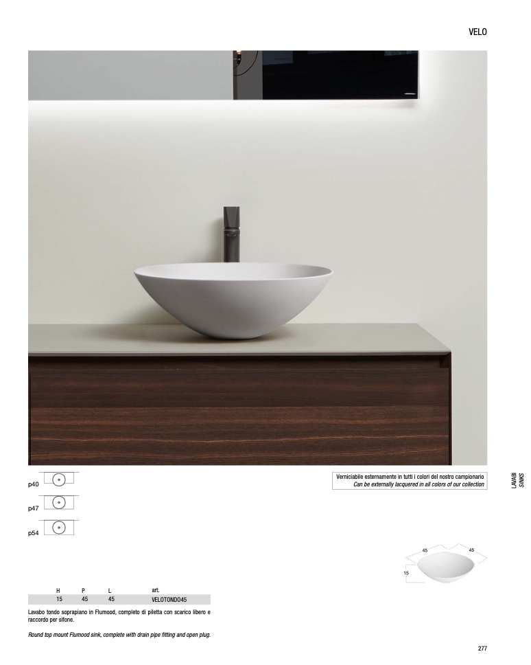 Lavabo tondo soprapiano in Flumood, completo di piletta con scarico libero e