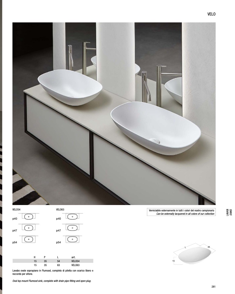 Lavabo ovale soprapiano in Flumood, completo di piletta con scarico libero e