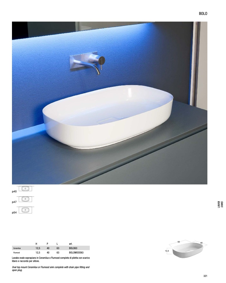 Lavabo ovale soprapiano in Ceramilux o Flumood completo di piletta con scarico