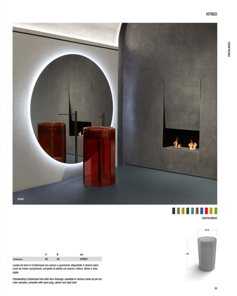 Freestanding Cristalmood sink with floor drainage, available in various colors as per our