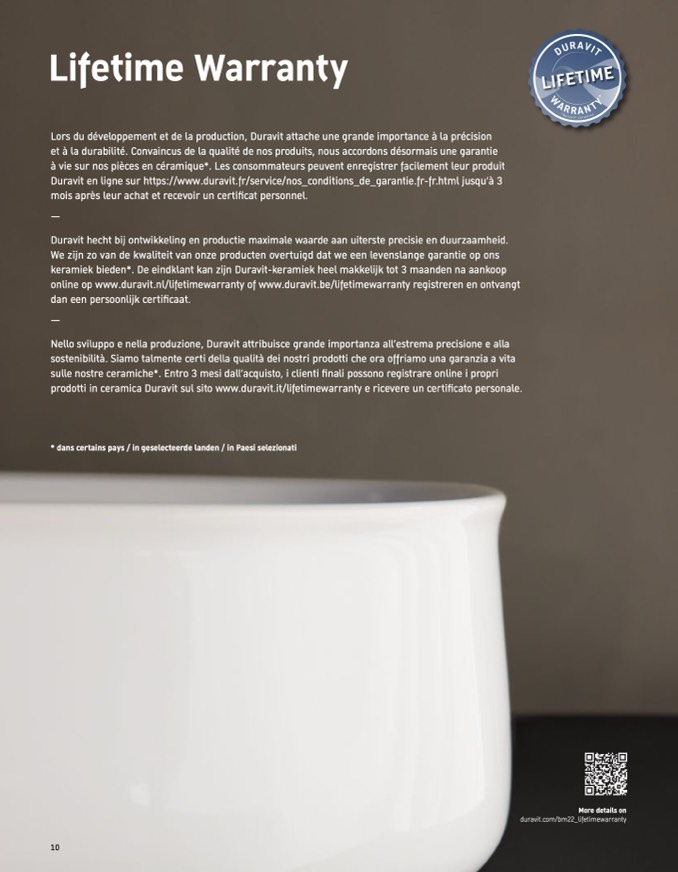 online op www.duravit.nl/lifetimewarranty of www.duravit.be/lifetimewarranty registreren en ontvangt