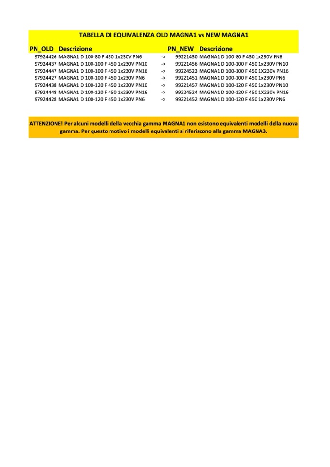 ATTENZIONE! Per alcuni modelli della vecchia gamma MAGNA1 non esistono equivalenti modelli della nuova