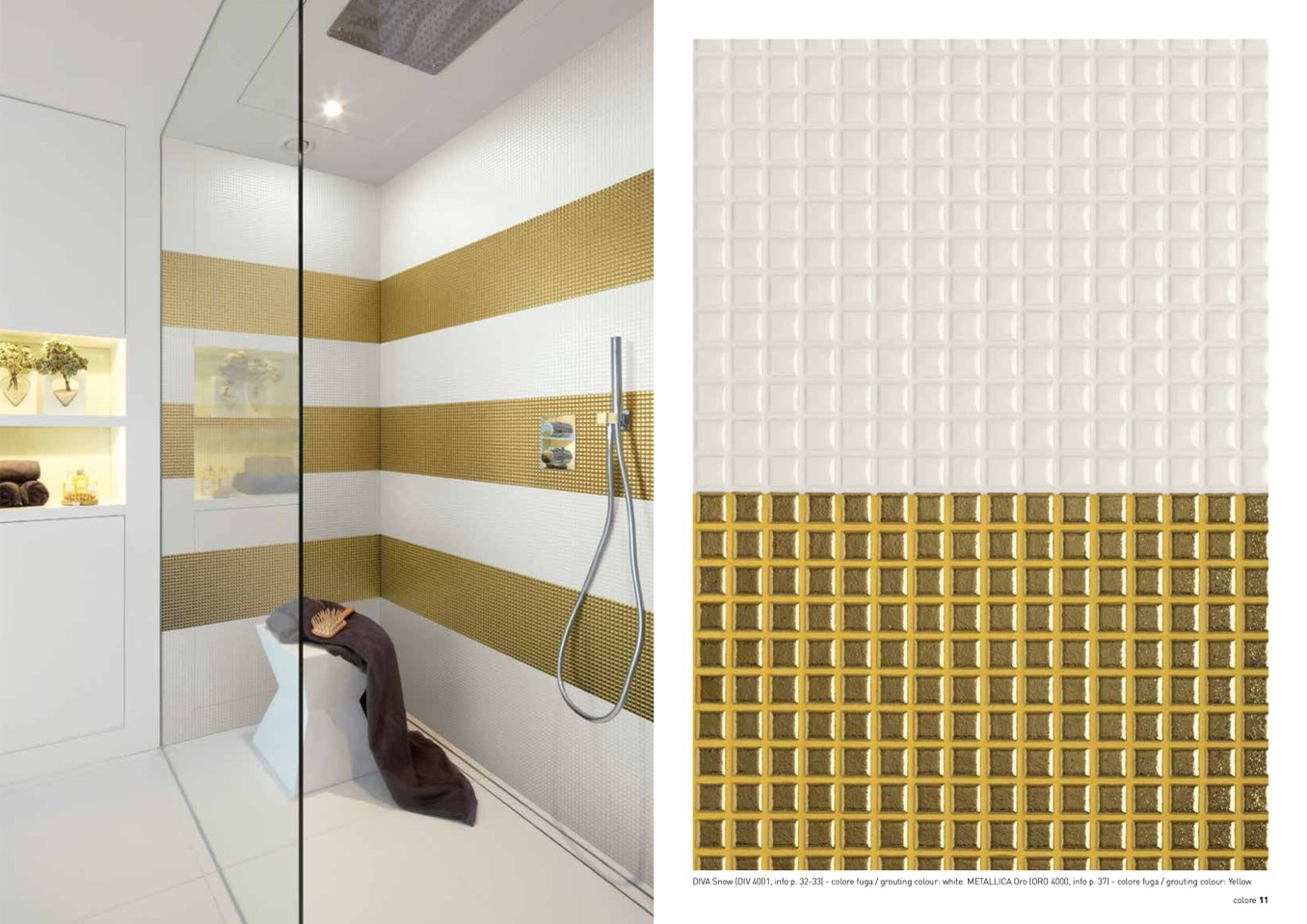 DIVA Snow (DIV 4001, info p. 32-33) - colore fuga / grouting colour: white. METALLICA Oro (ORO 4000, info p. 37) - colore fuga / grouting colour: Yellow