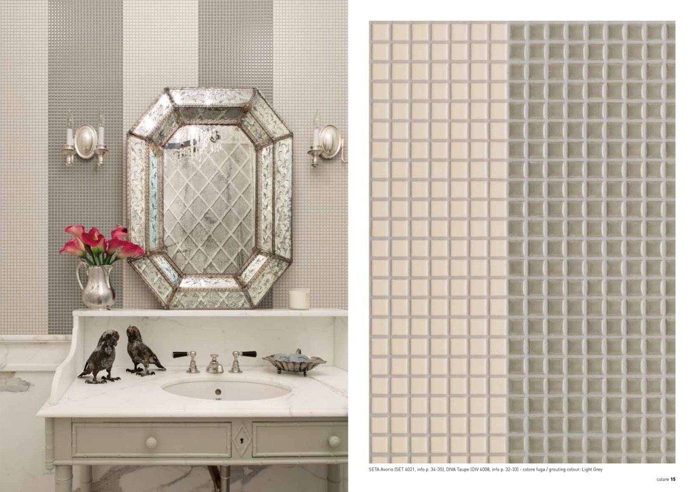 SETA Avorio (SET 4021, info p. 34-35), DIVA Taupe (DIV 4008, info p. 32-33) - colore fuga / grouting colour: Light Grey