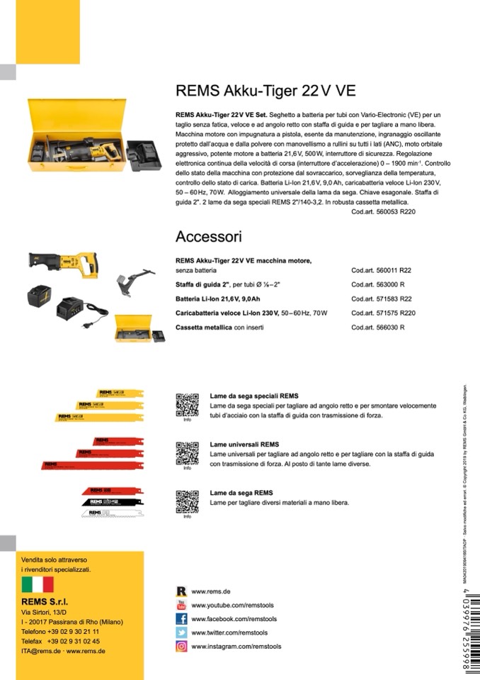 REMS Akku-Tiger 22 V VE Set. Seghetto a batteria per tubi con Vario-Electronic (VE) per un