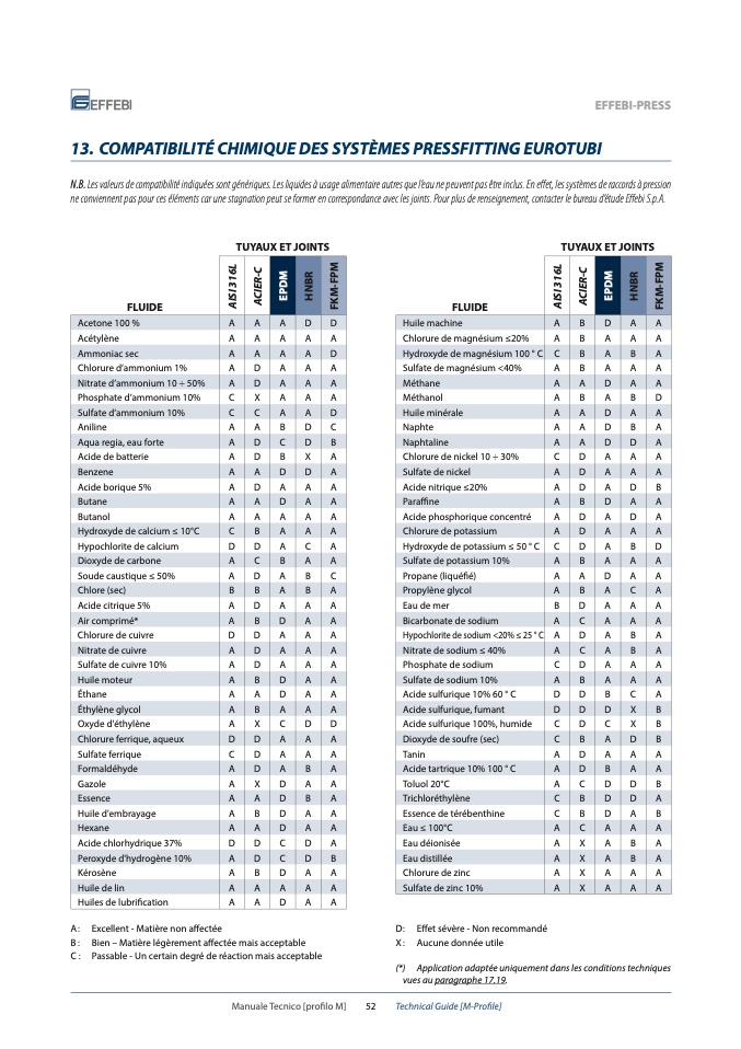 N.B. Les valeurs de compatibilité indiquées sont génériques. Les liquides à usage alimentaire autres que l’eau ne peuvent pas être inclus. En effet, les systèmes de raccords à pression