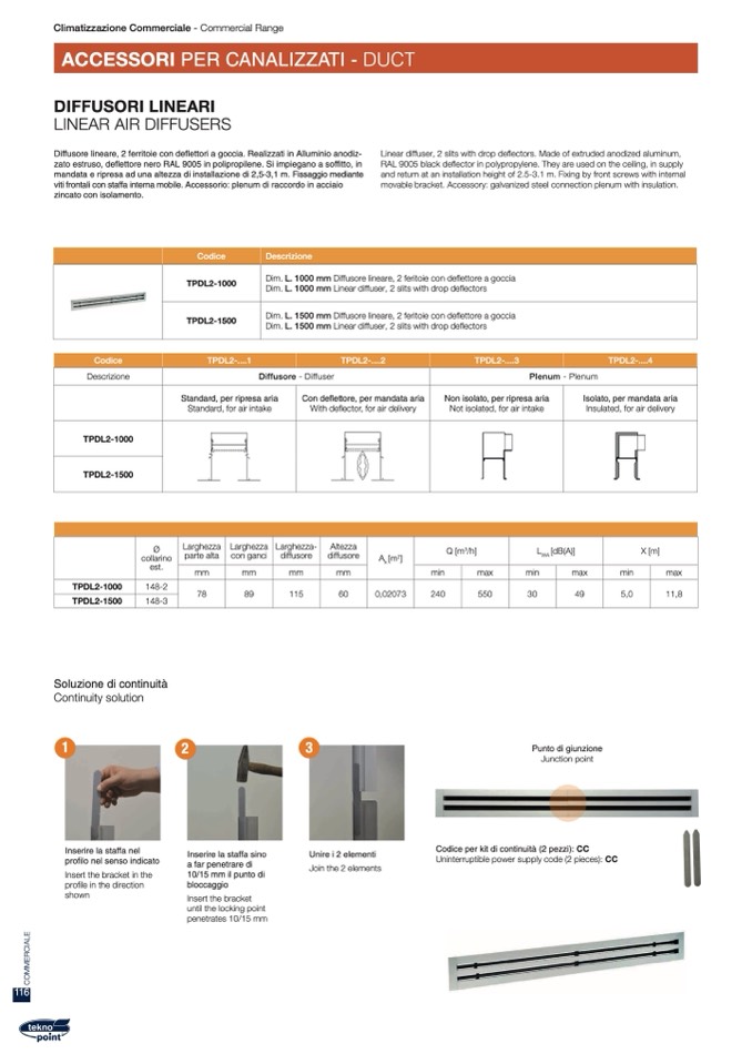 Dim. L. 1000 mm Diffusore lineare, 2 feritoie con deflettore a goccia