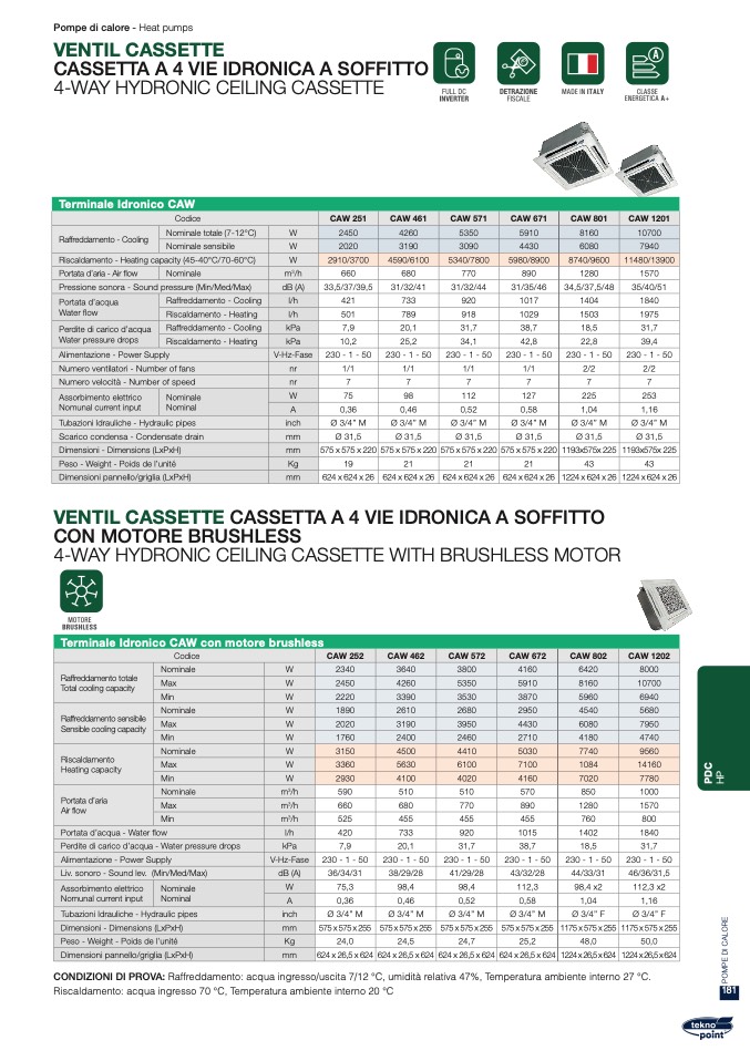 CONDIZIONI DI PROVA: Raffreddamento: acqua ingresso/uscita 7/12 °C, umidità relativa 47%, Temperatura ambiente interno 27 °C.