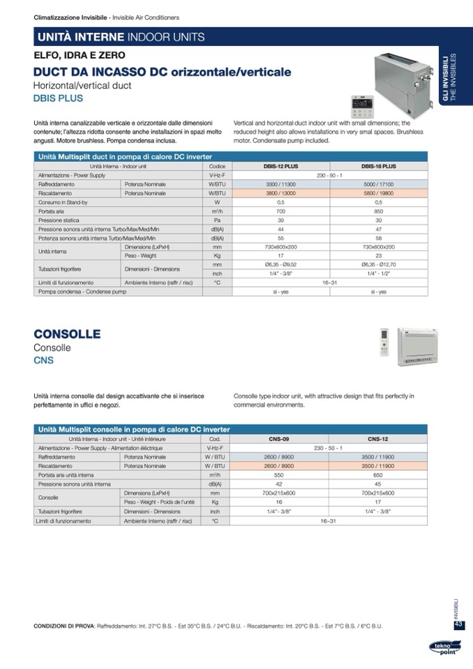 CONDIZIONI DI PROVA: Raffreddamento: Int. 27°C B.S. - Est 35°C B.S. / 24°C B.U. - Riscaldamento: Int. 20°C B.S. - Est 7°C B.S. / 6°C B.U.