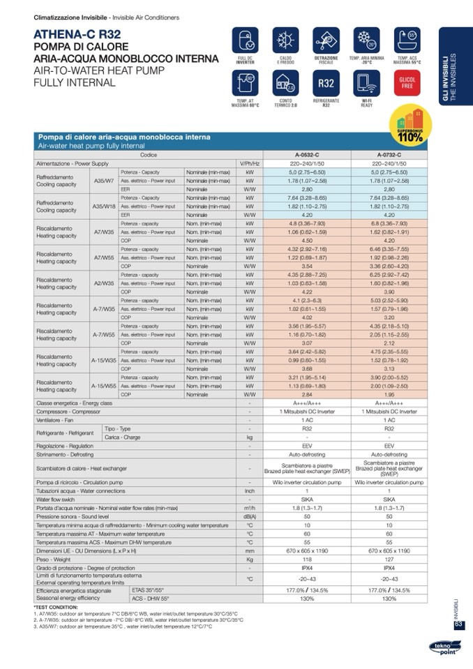 2. A-7/W35: outdoor air temperature -7°C DB/-8°C WB, water inlet/outlet temperature 30°C/35°C
