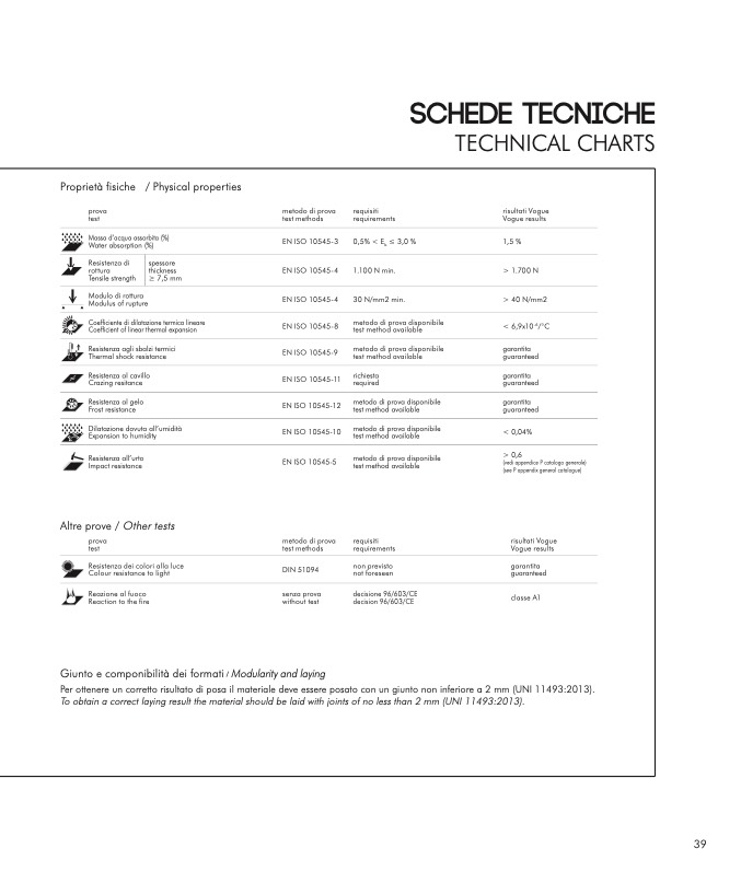 Per ottenere un corretto risultato di posa il materiale deve essere posato con un giunto non inferiore a 2 mm (UNI 11493:2013).