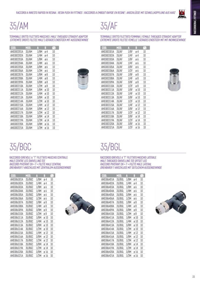 RACCORDI A INNESTO RAPIDO IN RESINA | RESIN PUSH IN FITTINGS | RACCORDS A EMBOUT RAPIDE EN RESINE | ANSCHLÜSSE MIT SCHNELLKOPPLUNG AUS HARZ