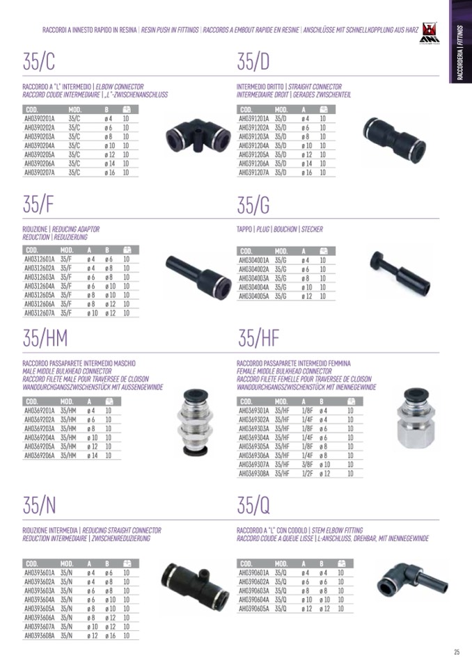 RACCORDI A INNESTO RAPIDO IN RESINA | RESIN PUSH IN FITTINGS | RACCORDS A EMBOUT RAPIDE EN RESINE | ANSCHLÜSSE MIT SCHNELLKOPPLUNG AUS HARZ