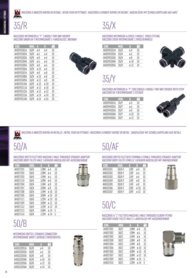 RACCORDI A INNESTO RAPIDO IN RESINA | RESIN PUSH IN FITTINGS | RACCORDS A EMBOUT RAPIDE EN RESINE | ANSCHLÜSSE MIT SCHNELLKOPPLUNG AUS HARZ