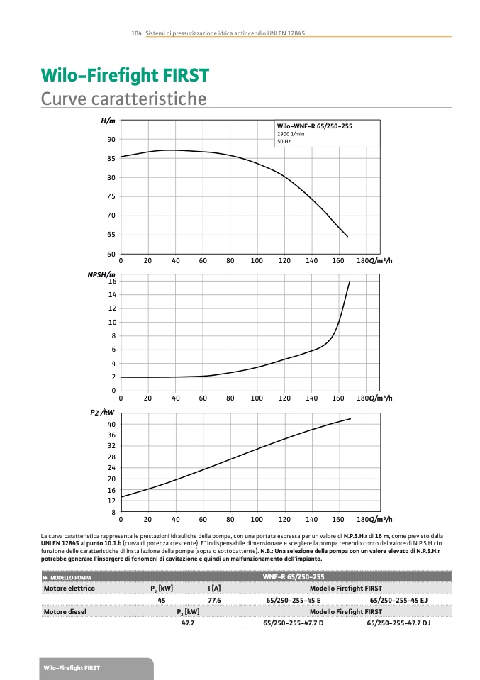 UNI EN 12845 al punto 10.1.b (curva di potenza crescente). E’ indispensabile dimensionare e scegliere la pompa tenendo conto del valore di N.P.S.H.r in