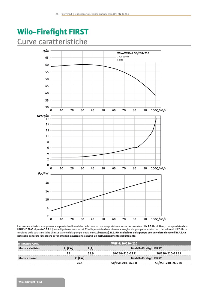 UNI EN 12845 al punto 10.1.b (curva di potenza crescente). E’ indispensabile dimensionare e scegliere la pompa tenendo conto del valore di N.P.S.H.r in
