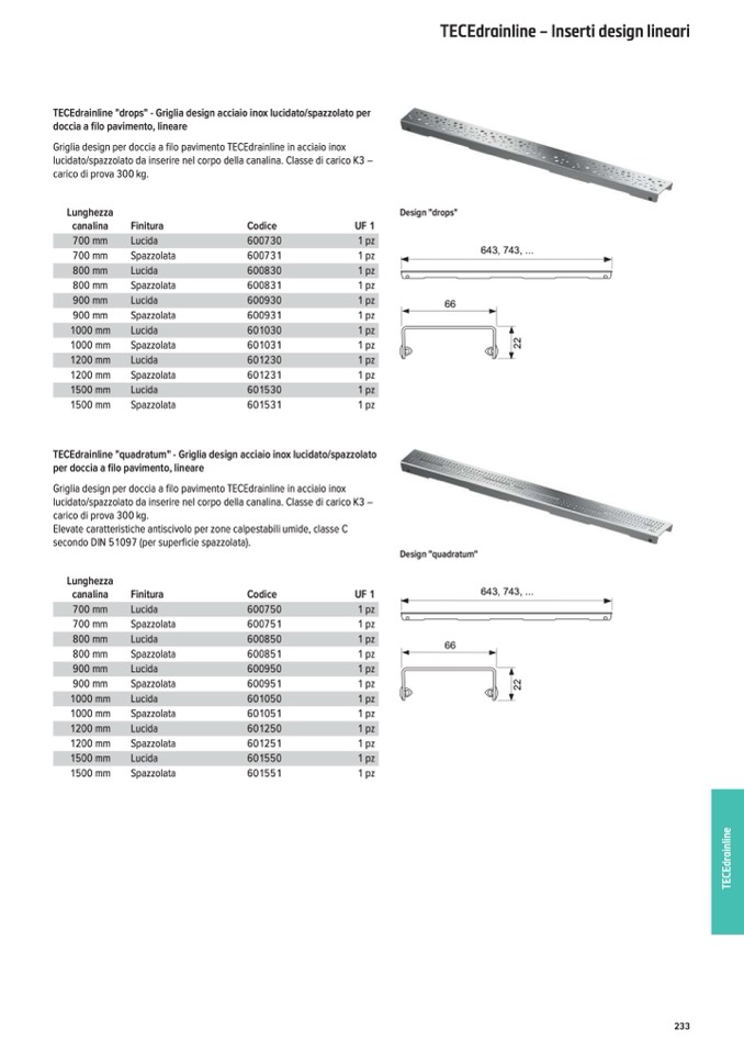 TECEdrainline "drops" - Griglia design acciaio inox lucidato/spazzolato per